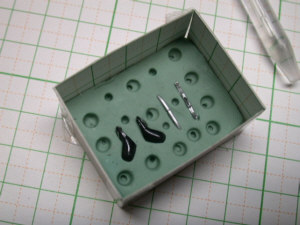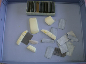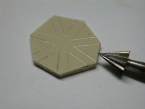 ![]() レジンの板にケガキます |
