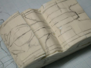 ![]() 鉛筆の下書きに沿って極細彫刻刀の出番 |