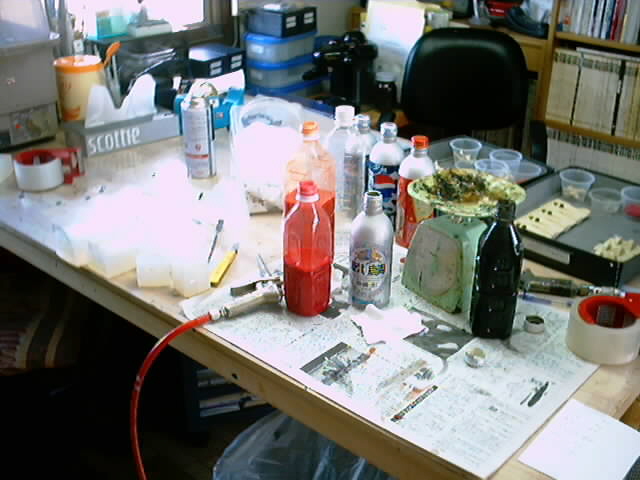 午前中のキャストの風景。色付きのペットボトルはカラートナー入りのレジン樹脂。
