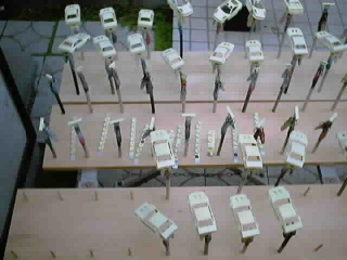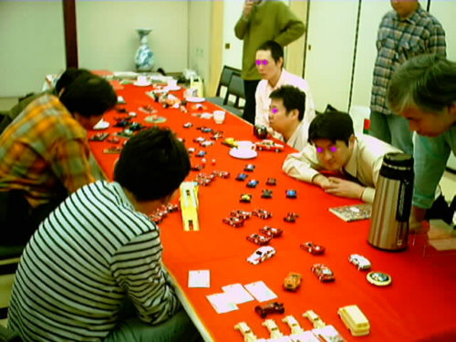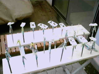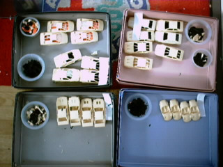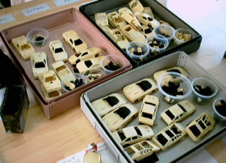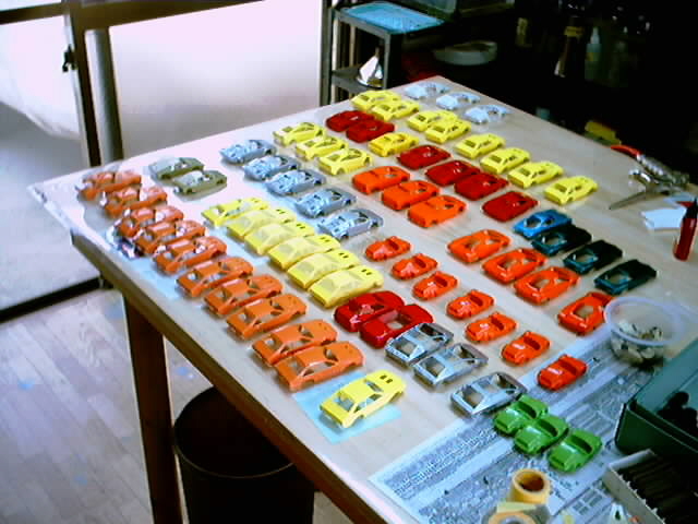![]() 夕日が沈む頃には72台ボディに全てサフェーサーがのりました。 レジンの地肌の時に発見できなかった気泡等をチェックします。 この気泡を埋めるには溶いたウレタンサフェで行いますが、染料を少し入れます。 色の違いで修正箇所がわかりやすくなり、その後のペーパー掛け等に役立ちます。 |
