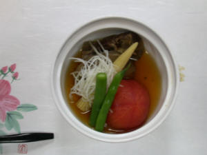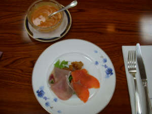 ![]() 私は冷スープとハムとサーモンの前菜 |