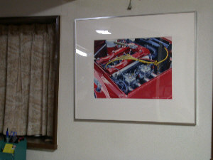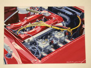 当時、乗っていたアルファのジュリアクーペのレースバージョンGTAのエンジンルームの描写です。ツインプラグのコードが涙物です。 八重洲の画廊でご本人とお話をして決めました。 価格を聞いて躊躇しましたが、コレを飾れるリビングのある家を建てようと目標が出来たので、今となっては記念に残る絵画になりました。 リトグラフの雰囲気も良いのですが、色彩の鮮やかさでは原画に勝るものはありません。 16年経った現在でもアルファレッドの輝きは失せません。 |