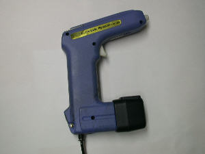 青いピストル式のエアガンは、静電気を除去してくれる魔法のエアガンです。黒い部分にはメーターが付いていて帯電数値を示してくれます。