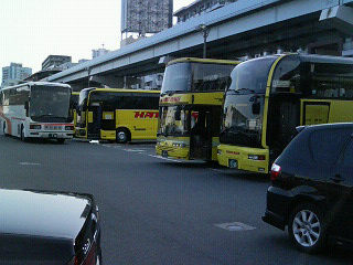 ![]() 到着は日の出桟橋、はとバスが待機 |