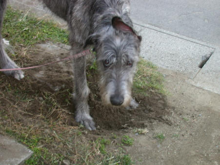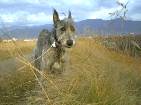 今日はとても暖かい一日でした。風が吹いてもフリースジャケット一枚でOK。 グレーブリンドル(最近白っぽく変化してきています)と枯れ草が同化して保護色状態です。 草むらに入ると、なぜか伏せ!! 気持ちいいのかな・・・・? |