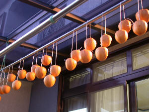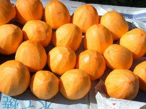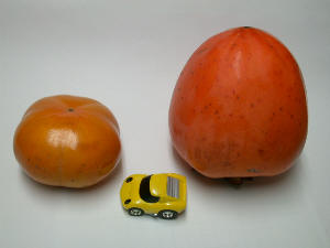 この大きな柿は干し柿用の"ひゃくめ柿"といいます。出来上がると手の甲くらいの大きさの"ころ柿"になります