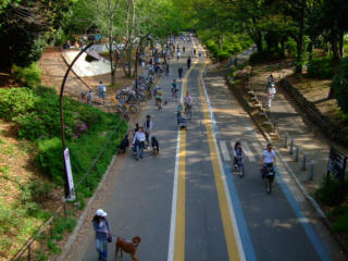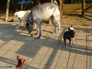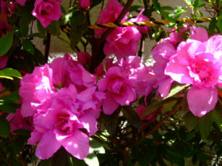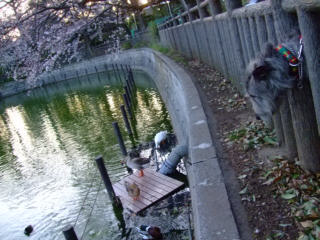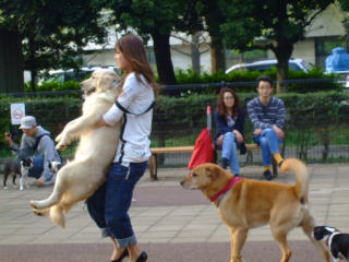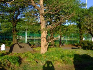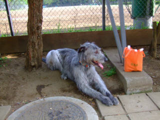 | 真夏日の駒沢公園、ラウラは土の冷たいところで休みます。気がついたら桜が散って、つつじの季節になりました。 | ||
