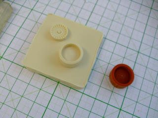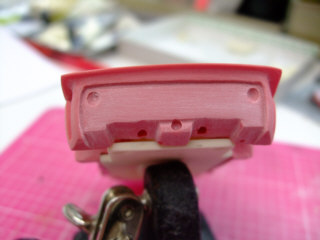 エッチングの原稿に合わせて型を修正します、コーラルレッドのレジンで面を修正していきます。