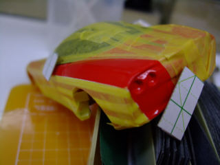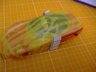 | マスキングテープはあくまでも仮のテープです。張ったところはカバーできますが、境目がどのようになっているか?どのように吹けば、綺麗にテープを剥がせるか。 | ||