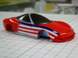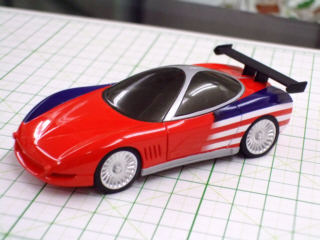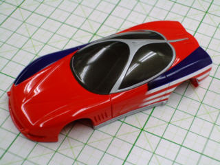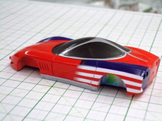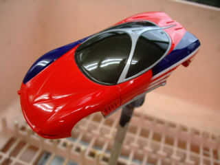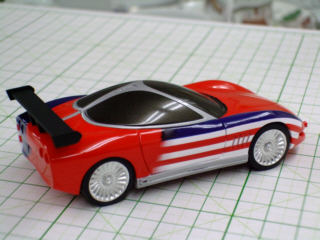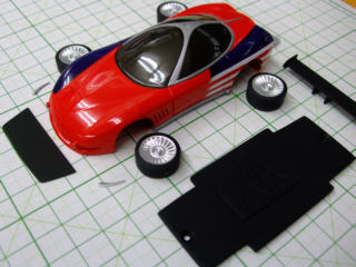 | 夕食後にテープを剥がせば、こんなんなってましたょw 星条旗カラーリングのボディにホイールと羽根を仮組、楽しいですwww | ||