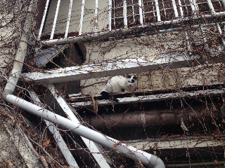 地域猫君、蔦の葉で生い茂る空き家が棲家なんです。